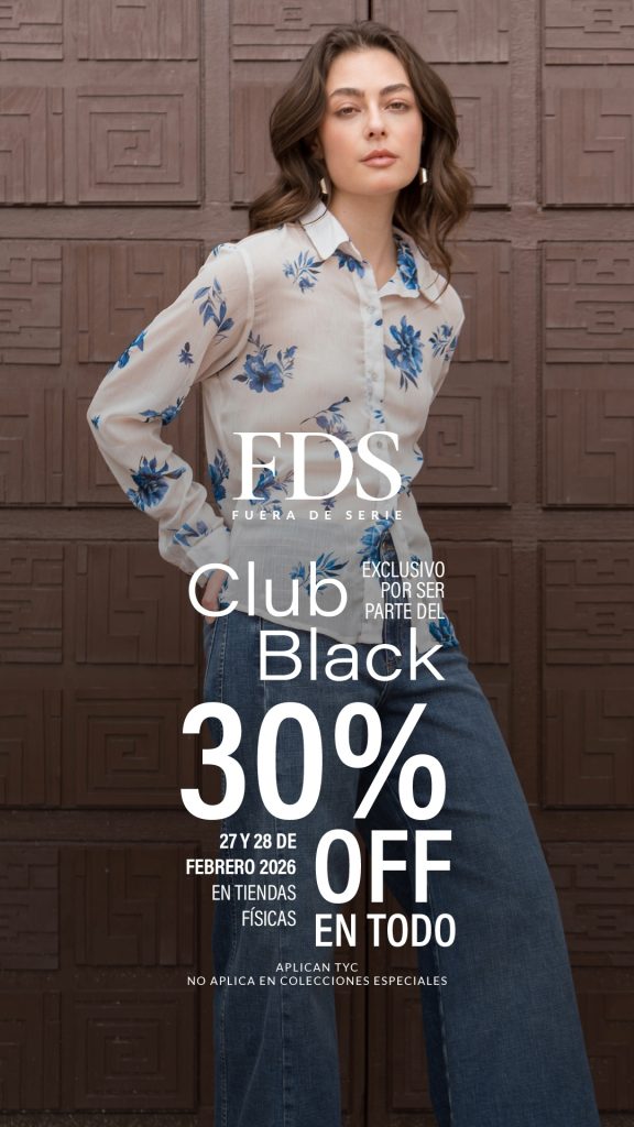 Ser parte del Club Black FDS tiene sus privilegios, Este 27 y 28 de febrero, disfruta 30% OFF en TODO en nuestras tiendas físicas, Una experiencia exclusiva por ser parte de Fuera De Serie. Es tu momento de enamorarte de eso que tanto quieres. Aplican TyC. No aplica en colecciones especiales.